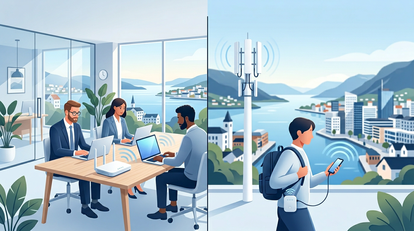 Forskjell på trådløst og mobilt bredbånd handler i korthet om hva som er trådløst: distribusjon innendørs (typisk WiFi) versus selve bæreren inn fra mobilnett. Mange bedrifter trenger begge – for eksempel fiber eller mobilt inn, og WiFi til ansatte.